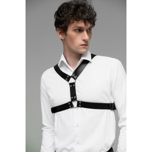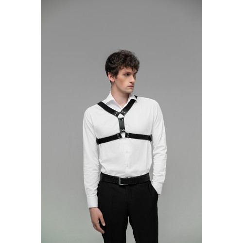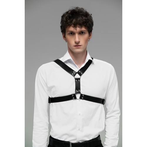 Мужская портупея на грудь через плечи состоит из ряда широких кожаных ремней, которые соединяются кольцами на груди и переходят на плечи, образуя уникальный дизайн.