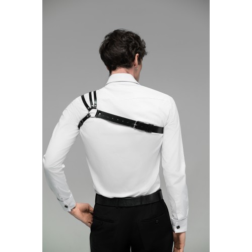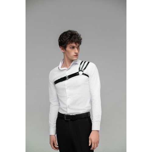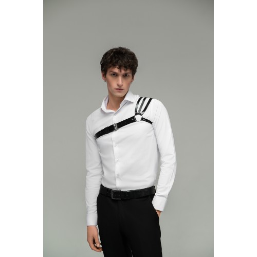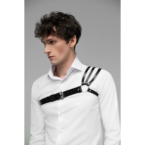 Мужская портупея на грудь через плечо состоит из ремня и лямок, главный ремень расположены на груди к которому прикреплено кольцо для крепления лямок которые располагаются на плече.