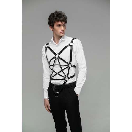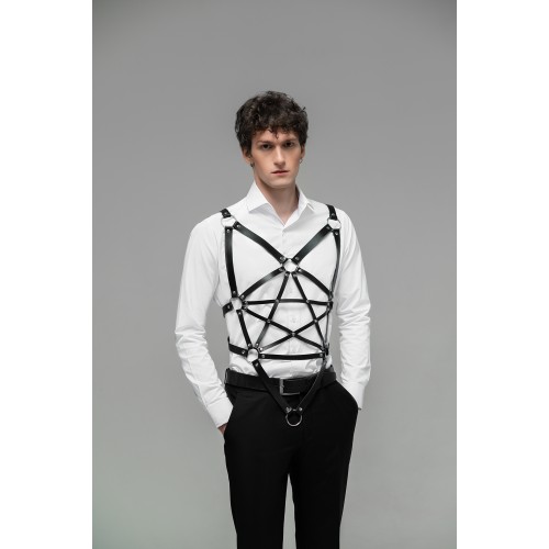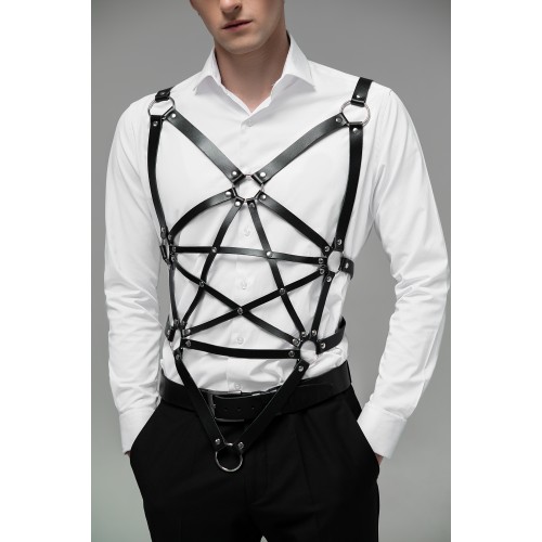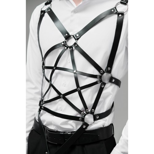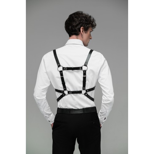 Портупея мужская с узорами и кольцами придает образу большую стильность и оригинальность. Черная кожа придает образу мужской силы и уверенности.